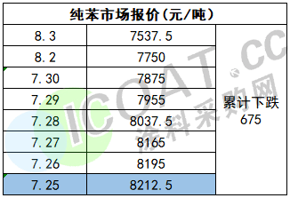 纯苯报价7537.50元/吨,目前 已经实现七连跌,累计下跌675元/吨。