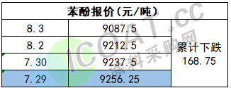苯酚报价9087.5元/吨,目前已实现三连跌,累计下跌168.75元/吨,