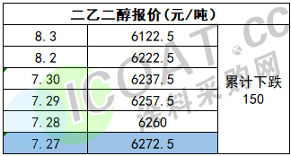 二乙二醇报价6122.5元/吨,目前已实现五连跌,累计下跌150元/吨。
