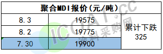 聚合MDI报价19575元/吨,目前已实现两连跌,累计下跌325元/吨。