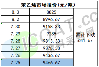 苯乙烯报价8825元/吨,目前已经实现七连跌,累计下跌641.67元/吨。