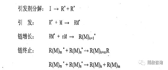 2.基态的氧分子处于三线态,本质上是双自由基,因此对光引发中产生的活性自由基有较强的加成活性,形成对乙烯基单体无活性的过氧自由基,此过程速率较快,可与活性自由基对单体的加成反应相竞争,对聚合过程的阻碍作用显著。有关氧分子阻聚的反应如下式所示: