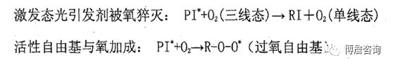 1.因为氧分子在UV固化体系中,同自由基反应产生竞争,如果氧分子竞争获胜,表现为严重的氧阻聚作用。其一,处于基三线态氧可以作为猝灭剂,将激发三线态的光引发剂猝灭,氧分子被激发至的单线态,光引发剂从激发态回到基态,阻碍活性自由基的产生。幸而大多类型光引发剂的激发三线态寿命较短,在激发态引发剂与分子氧作用前,就已经分解掉,氧分子与光引发剂发生双分子猝灭作用的几率相对较低,经常忽略。