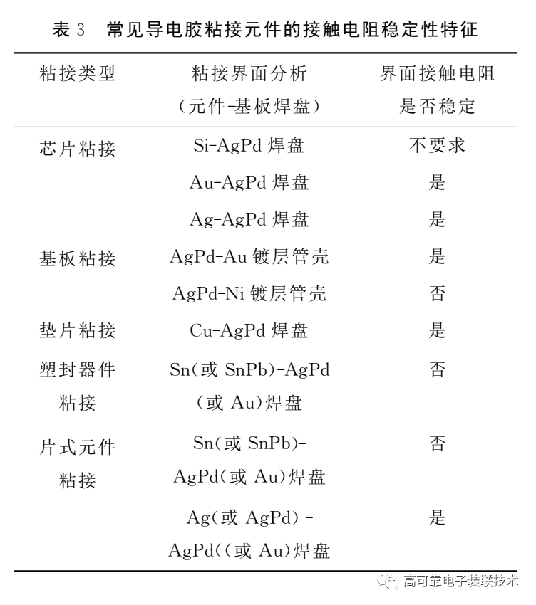常见的导电胶粘接元器件的接触电阻稳定性特征如表3所示。