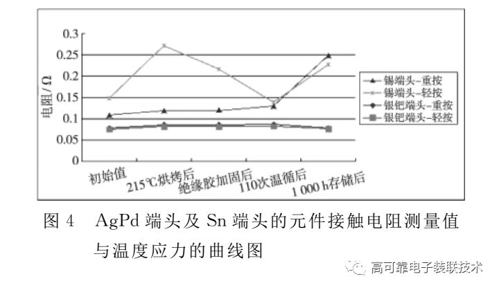 从图4可以看出:对于Ag基端头元件,经历各种按压力、加工温度及温循、高温储存后,其接触电阻均小于100mΩ,试验前后的接触电阻阻值无明显变化,表现出稳定的趋势;对于Sn端头元件,按压力的大小及215℃高温对其接触电阻存在一定影响,在按压力较大的情况下进行装配时,接触电阻均值小于250mΩ,虽然Sn端头元件的接触电阻大于Ag基元件的接触电阻,但其稳定 性 满 足 应 用 要 求;而Sn基元件在 按压力较 小的 情况 下 进 行 装 配 时,在215℃下短时间烘烤后,其接触电阻明显增大,超过250mΩ。