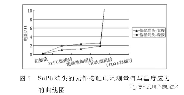 图5为SnPb端头元件的接触电阻测量值在不同温度应力下的曲线图。可以看出,对于SnPb端头元件,无论按压力大小,均在215℃短时间烘烤后出现接触电阻明显增大,甚至达到欧姆级,导电胶粘接元件接触电阻的稳定性较差。