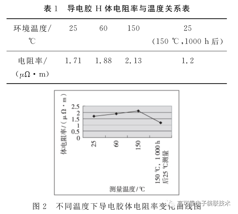 由表1和图2看出,导电胶在不同温度下的体电阻率非常稳定,而经过150℃,1000h高温储存后,导电胶电阻率保持相对稳定,数值略有下降。因此,在150℃温度范围内,导电胶自身体电阻率稳定,变化较小,不会引起粘接元件接触电阻的稳定性降低。