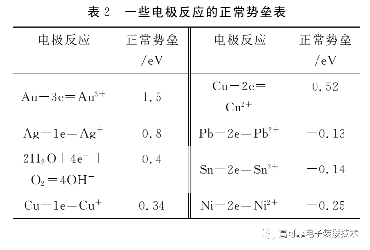 电偶腐蚀一般在2个条件满足时会发生:1)2种具有不同电化学势的金属接触,其中一种金属电化学势低于化学反应2H2O+4e-+O2=4OH-所对应的势能,一般为0.4eV;2)水溶液。非贵金属充当阳极时,化学反应为M-ne-=Mn+;具有较高化学势的贵金属(这里为 Ag)充当阴极时,化学反应为:2H2O+4e-+O2=4OH-,Mn+与4OH-相结合,形成金属氢氧化物,再转化为金属氧化物,因此在粘接界面上形成一层薄的金属氧化物,这一层薄氧化物的电阻远远高于非贵金属本身,老化后,粘接界面的接触电阻显著上升。一些电极反应的正常势垒如表2所示[5]。