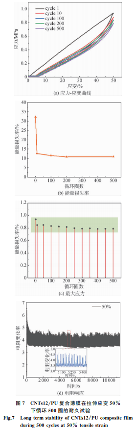 对于实际应用的应变传感器,耐久性是其非常重要的一个指标,较长的使用时间可以明显减少使用成本和增强实用性。在薄膜的拉伸应变为50%和拉伸速率为50mm/min的条件下,进行了500圈的循环拉伸释放测试,如图7所示。由图7(a)可知,CNTs12/PU复合薄膜在第一次拉伸后,由于PU材料的本身性质,出现了5%的不可逆应变,随后测试中拉伸和释放的曲线变化规律特别相近。由图7(b)和(c)可知,CNTs12/PU的能量损失率和最大应力都呈现下降趋势,并且下降的速度越来越慢。从具体情况来看,其能量损失率从第1圈的32.2%骤降到第10圈的12.6%,差值为19.6%,循环500圈后变为10.9%,仅下降1.7%。最大应力在第1圈为0.94MPa,经历10圈循环后减小为0.85MPa,差值为0.09MPa,循环结束后为0.79MPa,下降0.06MPa。由此可见力学性能的下降主要发生在前10圈。图7(d)展现了在500次循环过程中电阻的响应情况,电阻变化率在前20圈会有一个迅速下降的现象,后面基本稳定维持在一定范围内,230~250圈的变化也进一步证实这一点。在循环测试前期(0~20圈),复合薄膜会出现一定的不可恢复的形变,导电网络会发生大的破坏和重建以及少量CNTs的掉落,导致力学性能和应力传感性能下降明显,等到后期结构稳定后,其性能也得到较好的保持,因此证实了CNTs12/PU传感器拥有较好的重复性和耐久性。所以选择灵敏度最高、性能相对稳定的CNTs12/PU复合薄膜做进一步的研究。