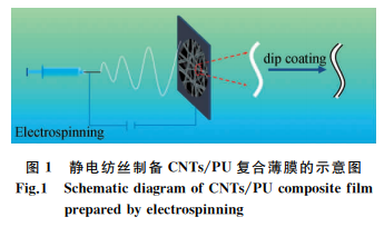 称取30mg的CNTs和150mg的十二烷基苯磺酸钠,加入到15mL的去离子水中。将细胞粉碎机的超声功率设置为25%,超声时间为30min,对CNTs进行超声处理,得到分散均匀的CNTs分散液。静电纺丝制备CNTs/PU复合薄膜的示意图如图1所示。利用优化的纺丝条件,通过静电纺丝制备PU薄膜,然后将PU薄膜放入到真空瓶中,利用真空泵抽走空气,再通过注射器将CNTs分散液注射到真空瓶中,将PU薄膜在真空环境下浸渍一定时间后取出,再放入70℃的鼓风烘箱中干燥12h,然后将其取出后放入装有去离子水的容器中,通过超声辅助,加强导电物质在纤维表面的牢固度,最后用去离子水清洗数次后烘干,得到导电的CNTs/PU薄膜,最后利用银浆将铜箔和铜线连接在膜上来研究其拉伸传感性能。