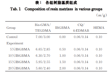 以不添加IBGBMA的Bis-GMA/TEGDMA传统树脂基质(质量比保持7∶3不变)作为对照组,以添加质量比分别为5%、10%、15%和20%IBGBMA的传统树脂基质为实验组。为促进IBGBMA在基质中充分快速混匀,各组均添加1%HEMA,40℃超声30min。具体配比见表1。