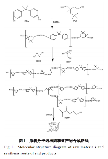 双酚A(BPA,99%)、异佛尔酮二异氰酸酯(IPDI,99%)、甲基丙烯酸羟乙酯(HEMA,95%)、二月桂酸二丁基锡(DBTDL,95%)和溴化钾(KBr,99%)均购自美国TCI公司,双甲基丙烯酸缩水甘油酸酯(Bis-GMA,99%)、三乙二醇二甲基丙烯酸酯(TEGDMA,95%)、樟脑醌(CQ,97%)和4-二甲氨基苯甲酸乙酯(4-EDMAB,99%)均购自美国SigmaAldrich公司,1,4-丁二醇(BDO,98%)和三羟基甲基丙烷(TMP,99%)购自上海源叶生物科技有限公司,石油醚和四氢呋喃(THF,99%)购自天津市精强化工有限公司。磁力搅拌仪(德国IKA公司),超声震荡仪(昆山市超声仪器有限公司),AG-XPLUS万能试验机和HMV-G20维氏硬度仪(日本岛津公司),电子分析天平(MATTELERAE240,北京晨曦勇创科技有限公司),LED可见光固化灯(SLC-Ⅷ,杭州四方公司),数显千分尺(桂林测量刀具有限公司),鼓风干燥箱(上海姚氏仪器设备厂),傅里叶变换红外光谱仪(FT-IR,VERTEX-80V,德国Bruker公司)。