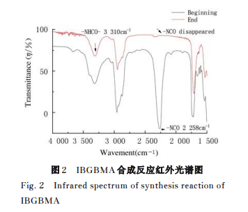 合成IBGBMA反应的第一阶段结束时,BPA的羟基与IPDI的-NCO基团反应,BPA的-OH峰消失;第二阶段,扩链剂BDO延长大分子链,交联剂TMP则使大分子具有更复杂的空间结构;最终阶段,HEMA的-OH与大分子链末端的-NCO反应,-NCO吸收峰消失,形成富含-NHCOO-基团并以C=C双键封端的反应性IBGBMA。在聚合反应中,IBGBMA末端的C=C双键可与树脂基质反应,形成稳定的化学键结合,短时间内即可固化。见图2。