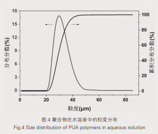 将聚合物分散在相应的溶液中,测试聚合物在溶液中形成的粒子尺寸及分散状态,可以表征聚合物作为成膜物质在光油溶液中的实际使用状态。本文将合成得到的聚乙二醇型聚氨酯丙烯酸酯分散在水溶液中,通过ZETA粒度仪进行表征,结果如图4所示。聚乙二醇型聚氨酯丙烯酸酯在水溶液中的以悬浮状态分散,分散程度较高,稳定性好,分散粒度尺寸在20~50μm范围内,基本以正态分布形式分散,分布比较集中,最大分布粒度约为30μm。粒度分析结果表明制备的聚乙二醇型聚氨酯丙烯酸酯聚合物分子较为纯净,分散粒度均匀,分散状态稳定,有利于光油在纸品表面的涂覆,以及光油固化成膜后的强度均匀。