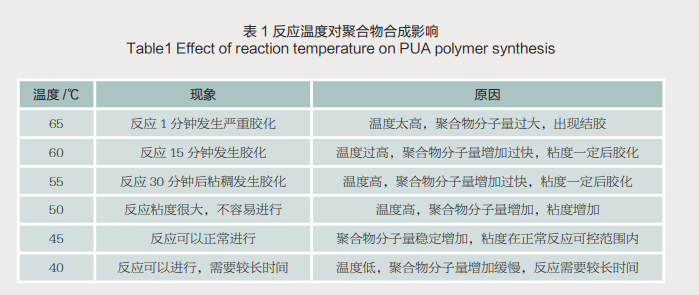 温度是影响合成反应的重要条件,在合成高分子物质时,温度会对相对分子量,分子量分布,支化度,反应产率等因素产生重要影响。当聚合物温度升高时,链转移反应增多,同时自由基增加,是分子链变短,形成长链大分子的几率降低,会导致最终大分子相对分子量达不到使用要求。本合成是放热反应,会使反应体系温度升高,合成中通过控制反应原料不变,改变聚合反应的温度,逐步由65℃降至40℃,通过反复多次试验探索最佳反应温度。温度对反应的影响如表1所示。