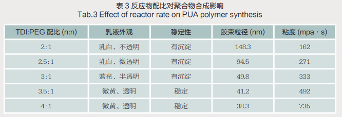 本试验在合成过程中由于TDI相对于PEG摩尔比至少要在2倍以上,所以合成过程中,对TDI与PEG不同摩尔比进行了比较,如表3所示。研究发现TDI与PEG摩尔比为3:1时,聚合物合成乳液稳定性较好,粘度适宜。