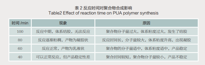 本实验中随着反应时间延长,体系中羟基和异氰酸酯基含量不断减少,氨基甲酸酯浓度则逐渐从零开始增加,在反应完成后,羟基应全部消耗,含量为零;如果反应达到终点时,继续延长反应时间,则会导致异氰酸酯基团发生副反应,得到副产物聚合物。由表2结果可见,预聚时间为60min时,反应可以正常进行,体系不会胶化,产品为乳液状,而且产品性能稳定性较好。所以,试验中将最佳反应时间设定为60min。