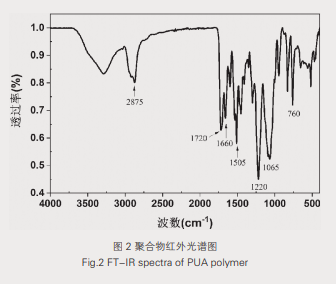 通过傅里叶变换红外光谱(FT-IR)可以表征聚合物分子结构中的化学键或官能团,不同TDI:PEG比例制备的聚乙二醇型聚氨酯丙烯酸酯聚合物红外光谱图如图2所示。在2270cm-1波数处没有明显的吸收峰,说明反应体系中的-NCO基团已经反应完全;2875cm-1处的吸收峰为-NH基团的吸收峰,说明反应体系中的-COOH基团已经完全中和;1720cm-1处的吸收峰为羰基特征吸收峰,并且在1505cm-1波数处有酰胺的N-H基团的弯曲吸收峰,说明聚合物中有大量氨基甲酸酯键;1660cm-1处的吸收峰是C=C的特征吸收峰,说明反应物甲基丙烯酸羟乙酯已经连接到产物主链上。1220cm-1、1065cm-1和760cm-1处的吸收峰是C=C上的C-H键面外弯曲振动吸收。红外谱图结果说明已经成功制备了聚乙二醇型聚氨酯丙烯酸酯聚合物。