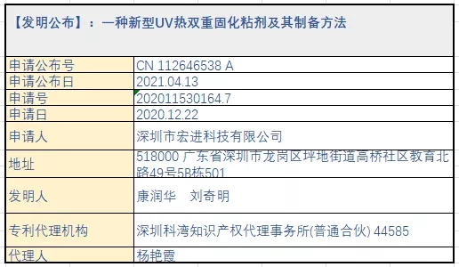 摘要:本发明公开了一种新型UV热双重固化胶粘剂,包括胶粘剂,所述胶粘剂包括:(A)100份环氧改性聚氨酯丙烯酸树脂,(B)0~200丙烯酸单体,(C)0~100环氧树脂,(D)0.01~5份光引发剂,(E)10~20份固化剂,(F)0.01~5份稳定剂,以及(G)0.0001~2份促进剂。UV热双重固化胶粘剂,既可以通过紫外光照射方式固化,也可以通过加热固化,得到的UV热双重固化粘剂具有优异的高强度及粘接密封性,并且还具有优异的紫外光固化性能和抗黄变性能,在连接器、传感器和光学器件的贴合中具有广泛的用途。