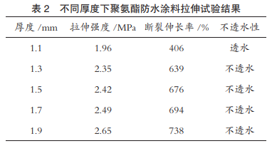 在满足温、湿度标准要求的养护条件下,制备1.1mm、1.3mm、1.5mm、1.7mm和1.9mm厚度的试件,试验结果如表2所示。从表2可以看出,当试件厚度为1.3mm、1.5mm、1.7mm和1.9mm时,其拉伸强度、断裂伸长率及不透水性均符合标准的技术要求,且随着厚度的增加拉伸强度及断裂伸长率都有小幅的增加。考虑到实际生产成本的因素,建议在满足标准技术要求的前提下,涂膜厚度可以控制在1.5mm±0.2mm。从表2也可以看出,当厚度为1.1mm时,其拉伸强度、断裂伸长率及不透水性均不满足标准的技术要求,因此在实际施工过程中,应避免涂膜厚度过薄而影响聚氨酯防水涂料的防水效果。