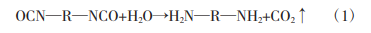 单组分聚氨酯防水涂料固化原理是含—NCO的活泼性端基能与空气中的水分发生反应,从而固化成膜,反应方程式如式(1)所示。温度升高,加剧胺类化合物催化异氰酸酯和水的反应,从而导致CO2的快速排放,在涂膜过程形成气泡,且温度升高导致聚氨酯弹性体发生软化变形,进而影响涂膜的物理性能。因此,在低温或高温环境下施工时,应选择高物理性能的聚氨酯防水涂料,保证其在施工中能够发挥正常的防水作用。