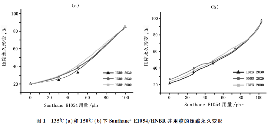 (1)SunthaneE2054与三种HNBR并用后,提高了材料的机械性能、老化性能,压缩永久形变得到改善。