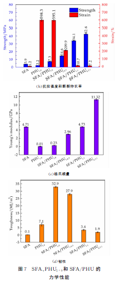 在室温条件下,通过单轴拉伸测试对SFA/PHU的力学性能进行了评估,其结果如图7所示.相比于丝素蛋白气凝胶,SFA/PHU均展现出了优异的力学性能.由于蚕丝在脱胶过程中,丝素蛋白肽链会发生断裂以及相对分子质量降低,使丝素蛋白气凝胶的三维网状结构不够稳定,从而导致其力学性能差(拉伸断裂强度仅为3.9MPa).同时,随着PHU在丝素蛋白气凝胶的多孔结构中原位合成,SFA/PHU1∶0相较PHU1∶0强度增加了5.1MPa,断裂韧性增加25.8MJ/m3,杨氏模量增加0.22GPa,说明在PHU 中添加增强材料SFA 能有效提高PHU 的力学性能.这是由于PHU 与丝素蛋白气凝胶之间的氢键相互作用所导致的.随着交联剂TREN 的添加([Priamine1074]/[TREN]的摩尔比从1/0到0.5/1),复合材料的断裂强度从7.3MPa增加至42.6MPa,断裂伸长率从595.1%降低至7.2%,杨氏模量从0.23GPa增加至11.32GPa,而断裂韧性随着TREN 的增加从32.9MJ/m3 降至1.9MJ/m3.当[Priamine1074]/[TREN]的摩尔比为0/1时,由于复合材料太脆,难以对其进行力学性能的表征.当[Priamine1074]/[TREN]的摩尔比为1/1 和0.5/1 时,SFA/PHU的机械性能可以与刚性复合材料相媲美,尤其当[Priamine1074]/[TREN]的摩尔比为0.5/1时,所得复合材料的拉伸断裂强度和杨氏模量达到最大,分别为42.6MPa和11.32GPa.这是由于SFA三维网络中PHU 的交联度随着交联剂TREN的增加而发生改变,使复合材料从韧性转变为刚性.因此,本文通过改变交联剂的添加量,制备得到了一系列具有不同机械性能得SFA/PHU复合材料.