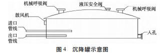 完成一次完整的生产后,使用稀料对反应釜进行清洗。使用后的稀料排入沉降罐中与空气接触。为了使得聚氨酯防水涂料沉降成固体,需要在沉降罐上方设有机械呼吸阀和鼓风机使沉降罐中空气充足。沉降后,上清液可排出继续做清洗剂,沉降的固体由工人回收处理。沉降罐结构图如图4所示。