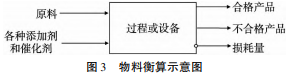 第一步要确定物料衡算的计算范围,第二步绘出物料衡算示意图,第三步选定该项目设计的计算基准,第四步确定此次物料衡算的相关数据。物料衡算的示意图如图3所示。