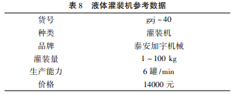 灌装是生产的最后一步,本项目设计中的灌装容量主要是5kg和20kg 的桶装。此次选用的是液体自动灌装机,它具有自动化程度高、省时省力、灌装速度快等优点,灌装时吸力大,通过袋式过滤器 ( 过滤器可承受8个压力) ,自动计量,自动称重进行灌装( 计量可从1~100kg以内) ,误差小,封口机在封口时可自动回位,是大型、中型、小型企业的实用设备。如表8所示。