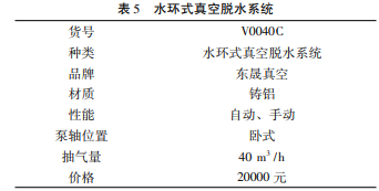 真空脱水系统用于原材料准备阶段的脱水过程,以便后续过程的进行。真空脱水系统选用的是水环式真空泵脱水系统,此系统是机电一体化的真空脱水机,可以连续进行吸收过滤和干燥操作,除去聚醚多元醇中的水分。该真空系统配备了一个作为主体的真空泵、真空表、电气控制系统等一体化设备。为响应国家环保的号召,此次选用的是环保型高性能真空泵,而且手动与自动操作可自行调控,真空度也可自行设置调节,适用于各种生产要求,也能方便配合市场变化的要求。该真空系统操作简单,减少了工人的负担; 占地面积少,方便移动,不需建设专用的独立泵房,减少了成本。如表5所示。