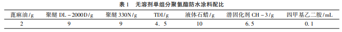 无溶剂型聚氨酯防水涂料的主要原料由聚醚多元醇 ( DL -2000D、330N) 、TDI、蓖麻油、液体石蜡、轻钙、催化剂四甲基乙二胺和潜固化剂 CH -3 组成。