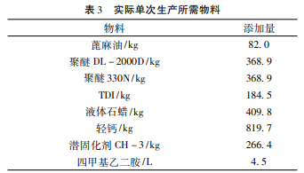 根据实验室获得的相关实验数据,单个反应釜每次生产 2500kg 的无溶剂型聚氨酯防水涂料,按照工业生产所需量进行同比例计算得到实际所需的原料数量。在实际的工业生产中,原料的实际使用量要考虑损耗量、产品合格率等问题。根据本课题中所得到的标准,按照最保守的标准估计原材料的数量。设聚氨酯防水涂料的合格率为 90% ,物料的自然损耗率为0.3% ,在设备中残留量和包装过程中损失量为 2% ,据此进行物料衡算。根据表 1 结果对实际单次无溶剂单组分聚氨酯防水涂料所需物料进行衡算,其中催化剂四甲基乙二胺占比很小,在总量计算时可以忽略不计。得出的结果如表 3 所示。
