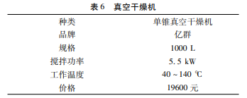 在生产过程中,需要对填料中的轻钙进行使用前的干燥处理,以除去轻钙中的水分。真空干燥器是一种通过抽出容器内的空气并形成预定的真空来去除容器内物料水分的装置。本项目选用的是单锥真空干燥机,内部有搅拌器,使得物料充分脱水。该干燥机有低压、复合间接加热、机身固定和螺带结构的特点,减少了干燥时间和耗能,使受热更加均匀。而且该真空干燥机可以与反应釜相连接,避免物料运输过程中水分的进入。如表6所示。