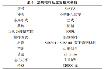 根据该项目的生产要求,该搅拌反应釜选择为立式圆筒形,这种型式的反应釜应用性最广泛,而且安装、操作和检修十分方便。搅拌器选用没有中间圆盘的开启式斜叶涡轮搅拌器,因为其具有良好的流循环能力和湍流扩散能力,不会干扰物料的混合,混合物残留量少,而且桨叶不易受损。因反应温度要求,为了使反应釜内温度受热均匀,选用导热油循环加热方式。由于反应釜具有自我冷却效果,它可以在高温情况下每天24h连续使用。此外,它不产生热量,不产生火花,可以在多尘、潮湿的环境中使用。加热搅拌反应釜各项技术参数如表 4 所示。