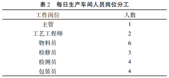 每日生产车间人员岗位分工如表 2。