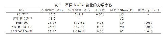 (1) 以HTPB、PPG、PCL、MDI为原料,DOPO为阻燃剂,制备了力学性能优良的聚氨酯并加入阻燃剂DOPO,当DOPO含量为10%时,聚氨酯的硬度、拉伸强度及弹性模量分别为邵氏92D、 33.15MPa、1050.84MPa,较纯聚氨酯分别增大3.4%、 32.2%、29.3%,密度降低3.8%。