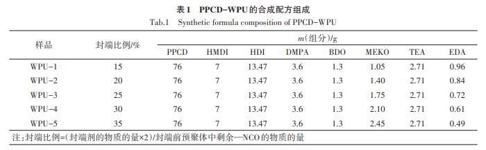 4,4'-二环己基甲烷二异氰酸酯(HMDI)、六亚 甲基二异氰酸酯(HDI),工业级,济宁诚泰化工有限 公司;聚碳酸亚丙酯多元醇(PPCD),工业级(Mn=3 000),广东达志环保科技股份有限公司;辛酸亚锡(T9)、丁酮肟(MEKO),分析纯,上海阿拉丁生化科技股份有限公司;2,2-二羟甲基丙酸(DMPA),工 业级,广州苏铖粤贸易有限公司;三乙胺(TEA),分 析纯,广州化学试剂厂;N,N-二甲基甲酰胺(DMF), 分析纯,广州市信洪贸易有限公司;丙酮(AT),分析纯,广州泽元贸易有限公司;1,4-丁二醇(BDO),分 析 纯 ,上 海 麦 克 林 生化 科技有限 公 司 ;乙 二 胺(EDA),分析纯,广州市梓兴化玻仪器有限公司;固化剂(WL72-100),工业级,旭化成精细化工(南 通)有限公司;去离子水,自制。
