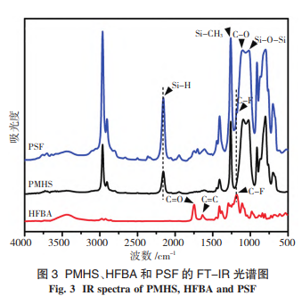 FT-IR 常用来表征合成产物的化学结构。HFBA、PMHS和 PSF 的 FT-IR 光谱如图 3 所示。经对比可以发现,HFBA 中位于 1644 cm-1 处代表 -C=C