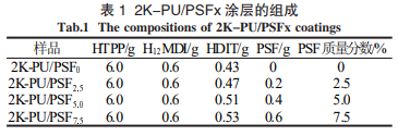 按表 1 将一定量的 HTPP、PSF 以及 0.5‰催化剂加入到烧杯中充分混合作为 A 组分,然后将 B 组分 H12MDI 和 HDIT 加入到以上混合物中。待混合均匀后,将液体混合物迅速转移至离型纸表面,并在90 ℃的烘箱中固化 2 h,熟化后得到 PSF 共价改性的 2K-PU 涂层,命名为 2K-PU/PSFx。其中,x 指的是 PSF 在 2K-PU 体系中添加量的质量百分比。