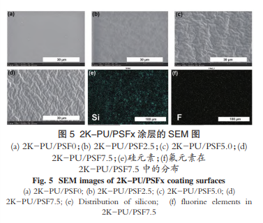 SEM 通常被用来观察涂层表面微观形貌。图 5(a)~ 图 5(d)为不同 PSF 添加量下 2K-PU 涂层的 表面形貌,从中可以明显地看出,随 PSF 添加量的增大,涂层表面变得粗糙,这是由于低表面能氟硅链段向涂层表面迁移所致。另外,利用 EDX 能谱对涂层中 F、Si 元素的分布进行了考察(图 5(e)和5(f)),结果表明氟硅元素在 2K-PU 涂层中分散性良好。