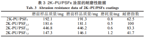 当聚氨酯被用作合成革等涂层使用时,其耐磨性是评价产品使用性能的重要指标之一。采用马丁代尔耐磨仪对氟硅改性前后 2K-PU 涂层耐磨性进行了考察,结果如表 3 所示。