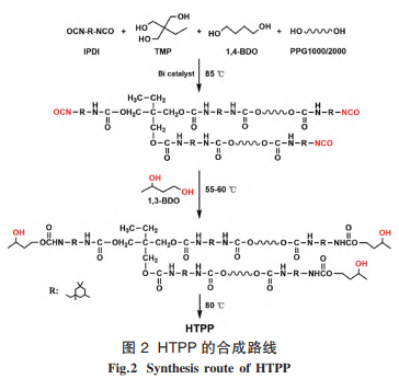 三口瓶中加入 60 g PPG-2000、15 g PPG-1000、38 g IPDI、1.5 g TMP、3 g 1,4-BDO、0.1 g 有机铋催化剂,于 85 ℃反应 2.5 h,降温至 50 ℃,加入 13.7 g 1,3-BDO(n(-OH)∶n(-NCO)=2∶1),于 55~60 ℃反应 1 h,继续升温至 80 ℃反应 1.5 h,待全部 NCO 反应完全后,即得到羟基封端的聚氨酯预聚体 HTPP,见图 2。