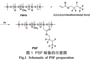 将计量的 PMHS、对二甲苯、阻聚剂吩噻嗪和karstedt’s 催化剂加入至带有温度计、机械搅拌、回流冷凝及通 N2 保护装置的四口烧瓶中,升温至 100℃。待温度稳定后,采用恒压滴液漏斗将事先配制好的 HFBA- 对二甲苯溶液匀速滴入至烧瓶中,约1.5 h 滴加完毕,滴加期间反应温度控制在 120 ℃。滴加完毕后,继续保温反应 2 h,直至经测定 Si-H含量达设定值(0.09%),停止反应。最后,采用旋转蒸发仪除去体系中的溶剂和残余 HFBA,即得到改 性剂 PSF,见图 1。