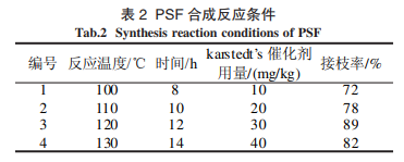 在硅氢加成聚合反应过程中,反应温度、时间以及催化剂用量均会对产物的接枝率造成影响。因 此,为了获得较为合适的 PSF 合成工艺,对其反应条件进行了探索和优化,结果如表 2 所示。
