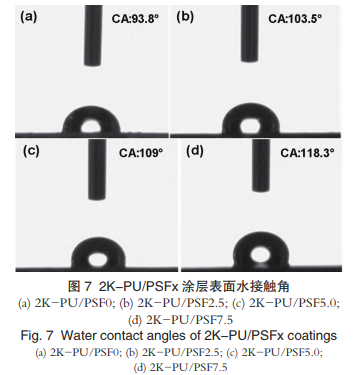 从 图 中 可 以 看 出 , 随 PSF 添 加 量 增 大 , 2K-PU/PSF 涂层的表面水接触角逐渐增加。空白2K-PU 的 WCA 为 93.8°,而当 PSF 添加量增加到 7.5%时,WCA 可高达 118.3°,提升约 26%。以上结果表明氟硅链段的引入对聚氨酯涂层疏水性能的提升具有显著作用。