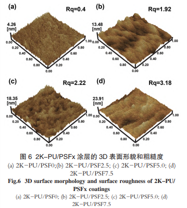 为了进一步验证表面粗糙度的变化,采用 AFM对 2K-PU/PSFx 涂层的表面粗糙度进行了表征,结果如图 6 所示。从 AFM 图像中可以看出,空白2K-PU 薄膜的表面较为平坦,粗糙度 Rq 仅为 0.4。随着 PSF 的引入,涂层表面粗糙度增大。与纯2K-PU 相比,添加 2.5、5.0 和 7.5% PSF 的 2K-PU 涂层表面粗糙度分别 增 大 至 1.92、2.22 和 3.18,与SEM 结果相符合。由此可见氟硅链段的引入会增加聚氨酯涂层的 表面粗糙度。
