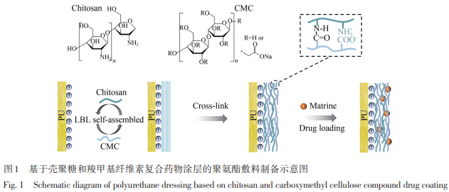 本文旨在利用静电吸附作用将CHI/CMC复合药物涂层制备到聚氨酯(Polyurethane,PU)敷料上,组装示意图如图1所示。通过化学交联改变自组装涂层的内部结构,增加其稳定性从而将抗菌中药小分子苦参碱(Matrine,MAT)结合到涂层上,并提升聚氨酯敷料的机械性能。该载药交联涂层能抑制大肠杆菌 (E. coli)和金黄色葡萄球菌(S. aureus)的生长,结合壳聚糖潜在的抗菌性能,对细菌的抑制作用进一步增强。这种稳定的交联涂层为植入体、医疗器械和医学设备表面改性涂层的开发及应用扩展提供了新的方法和思路,基于抗菌性壳聚糖/羧甲基纤维素复合药物涂层的聚氨酯敷料有望作为创面敷料应用于临床。