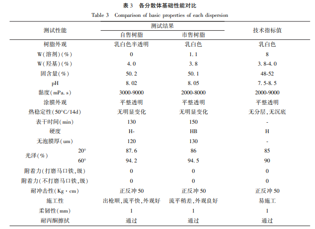 通过表 3 可知,自售羟丙分散体与市售羟丙在分散体再采用科思创 2655 固化剂复配后,涂层 的基本物理性能差异不大,两者均具有较好的基础物理性能,两者在基础物理性能方面均能一定程度地满足轨交大巴应用领域,但自售羟丙分散体在硬度、光泽、施工性、表干速度等基本方面较市售羟丙分散体有着更好的表现。