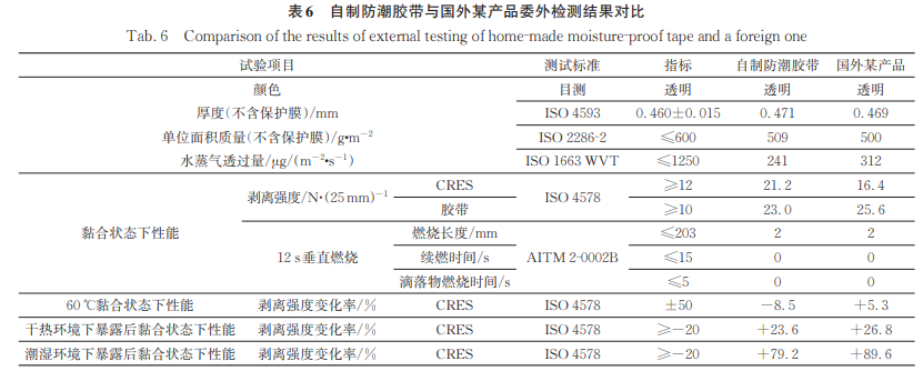 以聚氨酯树脂 A198FR 作为树脂原料通过挤出流延制得聚氨酯薄膜 Defense 1195,并选用75%含量的YY16作为胶黏剂与EAC混合均匀 涂布于基膜,制得的防潮胶带委托第三方进行性能测试,并对比国外某产品,其结果见表 6。通过表 6 对比自制防潮胶带和国外某产品的委外检测数据可以得出以下结论: